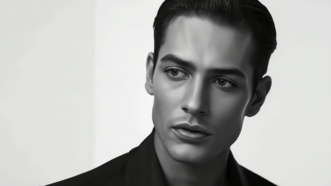 AI Generated Image. Stylish depiction of a handsome male model looking pensively off-camera, wearing a sleek black suit. Ideal for fashion magazines, men's style blogs, or advertisements focusing on luxury and elegance. The monochrome palette emphasizes the subject's sharp features and intense expression, making it perfect for promoting sophisticated products and services.