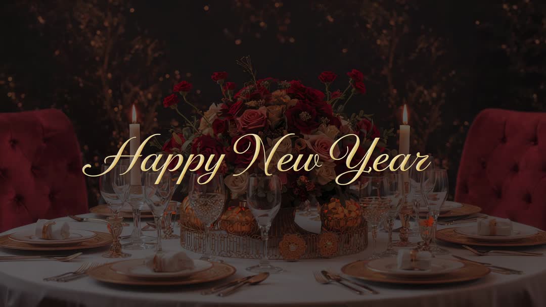 AI Generated Image. Scene showcasing opulent New Year dinner table with roses, lit candles, and crystal glassware. Camera performing slow pan across round banquet table, capturing gold script overlay and warm bokeh lights. Ideal for New Year promotional videos, holiday greeting reels, restaurant Eve event ads, luxury event highlights, and invitation animations. Graphic designers overlaying text or logo using central negative space above centerpiece. Editors applying warm color grade and soft focus transition for romantic festive mood. Footage looping well for social media banners, website hero headers, and in-store digital signage. Stock licensing allowing use in print greeting cards, email campaigns, event planning portfolios, and luxury hospitality marketing.