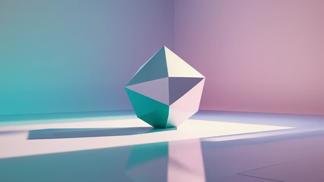 AI Generated Image. This video showcases a futuristic polyhedron placed in the corner of a softly lit room. The teal and pink ambient glow enhances the geometric abstraction, complementing the reflective surface of the floor. Perfect for tech-themed marketing materials, modern design portfolios, or contemporary art websites looking for striking visual content.