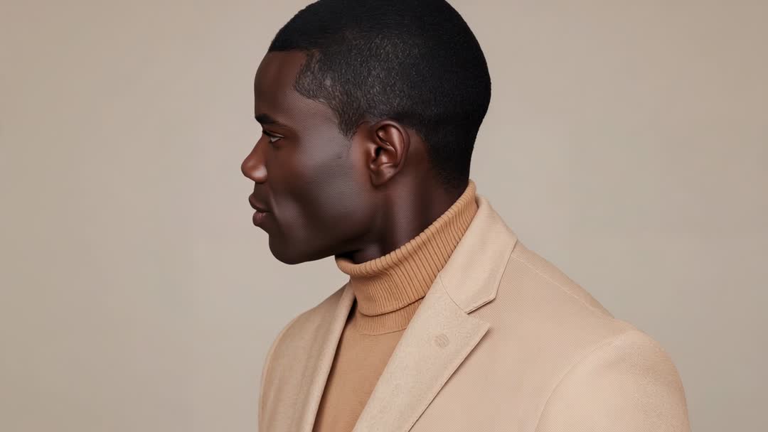 AI Generated Image. AI-generated video showcasing a male model pivoting to a profile view, subtly nodding while wearing a tan blazer, captured in a curved studio space with neutral tones. Ideal for use in content focusing on business consulting, fashion trends, portrait studies, minimalist design, branding for financial services, or illustrations highlighting professional appearance, elegance, and contemporary style.