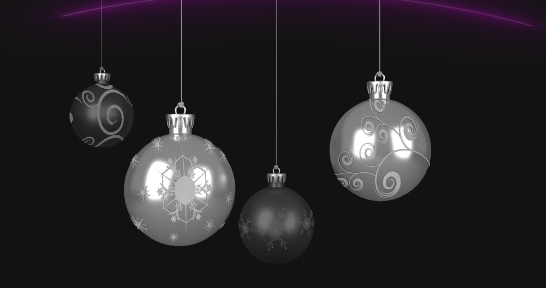 Christmas baubles in shades of silver and black dangle against a black background, creating a modern and sophisticated festive atmosphere. Ideal for use in holiday marketing materials, digital greetings, or illustrations for elegant Christmas-themed events and promotions.