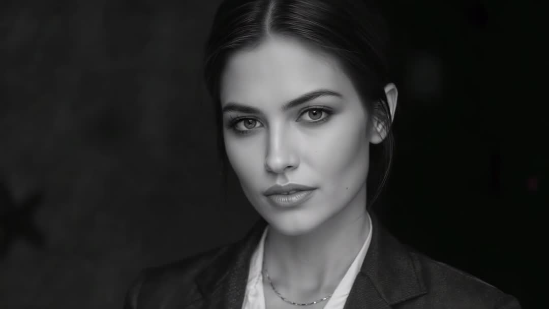 AI Generated Image. This black and white video captures a woman wearing a blazer and a silver chain as she turns her head and gazes forward with an introspective expression. Ideal for content focusing on portraiture, professionalism, and elegance. Perfect for use in articles about confidence, fashion featuring minimalist style, or personal growth in blogs about self-reflection.
