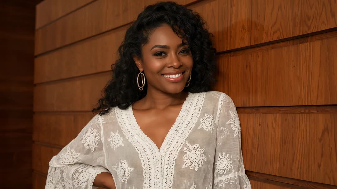 AI Generated Image. Elegant woman with a confident smile in a charming embroidered blouse and gold hoop earrings poses against a wooden wall backdrop. The setting brings warmth, accentuating her graceful look and casual fashion style. This scene highlights elegance and modern fashion perfect for depicting lifestyle choices or style inspiration. Great for use in articles about fashion, elegance, interior decor, or personal style advice showcases.