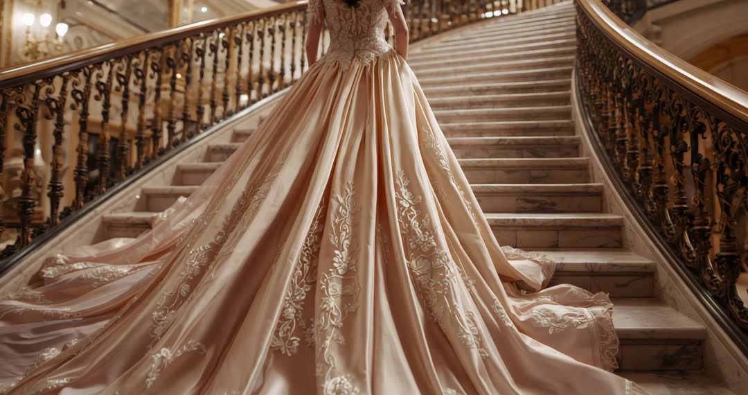 AI Generated Image. A woman elegantly ascends an opulent marble staircase, showcasing an impressive gown with intricate embroidery. This scene reflects luxury and grandeur often seen in palatial spaces and formal events. Ideal for content emphasizing sophistication or aspiration and for storytelling in settings about aristocracy, high fashion, or historical drama.