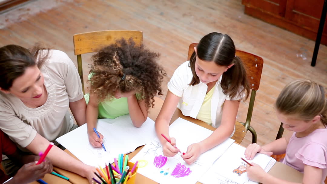 Teacher and students engaging in a collaborative drawing activity in an elementary school setting. Various art supplies like colored pencils are visible on the table. This video can be used for educational publications, school brochures, or children's creative programs emphasizing teamwork and creativity in learning environments.