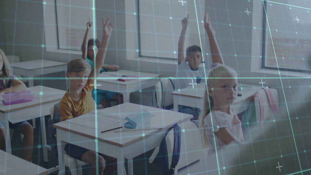 Elementary Students Raising Hands Responding to Teacher Gesture with Holographic Grid Overlay Video