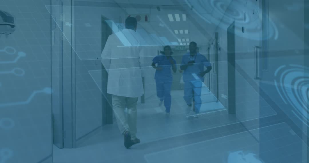 Healthcare professionals in hospital uniforms respond urgently to an emergency situation in a bright corridor, layered with vital signs data overlays. This video can be useful for events, seminars on emergency medical response, articles about hospital teamwork, showcasing healthcare communication advancements, or representing medical emergency protocols.