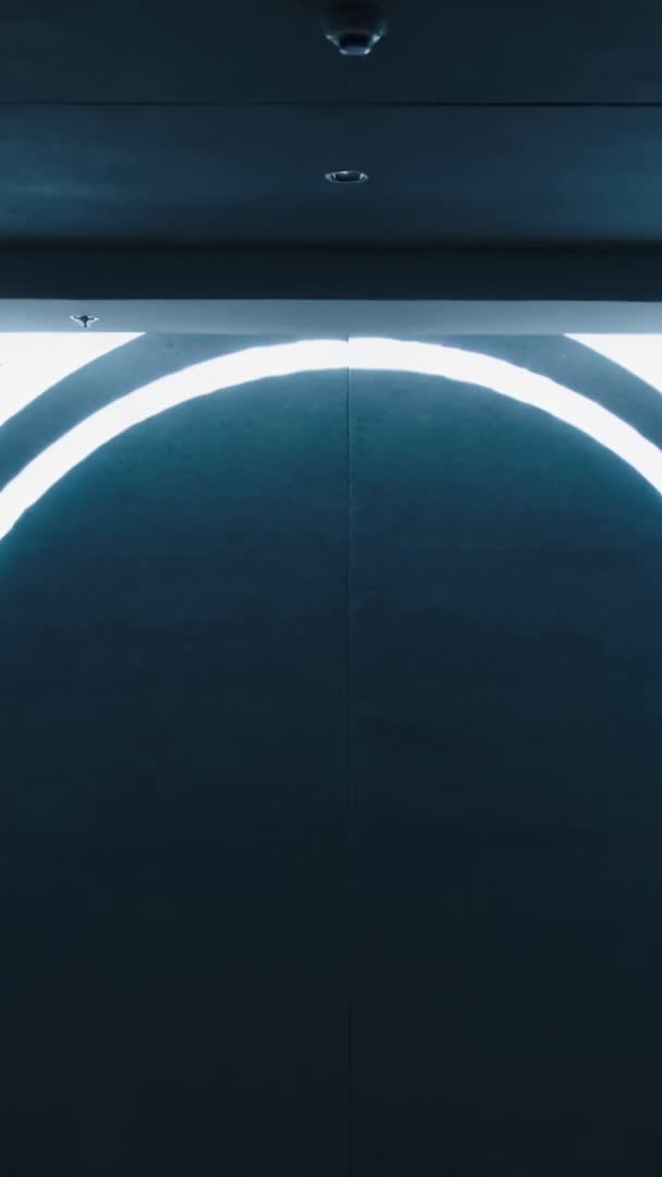 AI Generated Video. Vertical video showing concentric light rings emerging from top LED band on dark corridor wall. Minimal architectural composition featuring strong symmetry and glowing arcs in cool blue tones. Motion of rings creating hypnotic loop, suiting use as ambient background for technology, design, fashion, music projects. Offering clean negative space for overlaid text, logos, lower-third graphics. Working well for title sequences, social media reels, event promotion, experimental films, product showcases. Visuals complementing branding, UI demos, gallery installations, minimalist presentations. Ideal for creating futuristic, cinematic, ambient mood and guiding viewer eye toward upper frame.