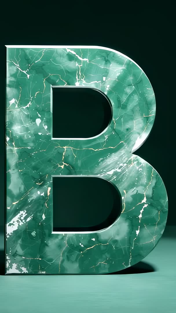 AI Generated Image. Minimal vertical motion graphic showing emerald marble letter B emerging and shifting on dark platform, highlighting gold veins and glossy polish. Perfect for luxury brand intros, logo reveals, title sequences, and social media reels. Providing high-end visual for fashion, jewelry, interior design, and premium packaging campaigns. Offering close-up texture study for material libraries and background for editorial or advertising layouts. Delivering cinematic studio lighting and deep green palette for upscale branding. Edit-friendly composition allowing text overlays, animated reveal timing, and color grading.