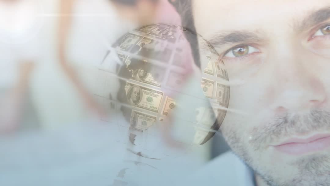 Emerging Male Executive With Breaking Dollar Globe Overlay Video