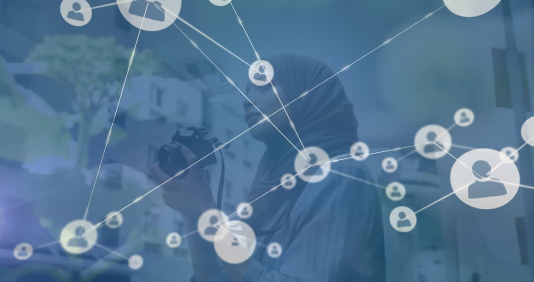 Image shows a young photographer intertwined with digital network symbols, depicting the merging of creativity and technology. Useful for illustrating concepts of global communication, technological innovation, and multicultural connectivity in presentations, articles, or marketing materials related to photography, social media influence, or digital advancements.
