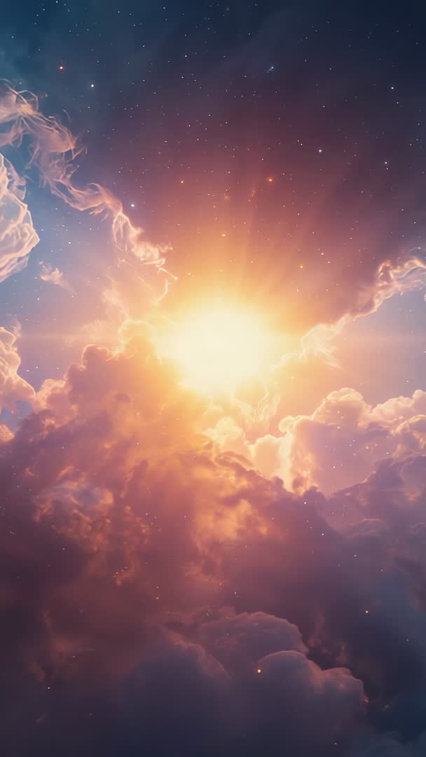 AI Generated Video. Vertical 4K video capturing emerging sunburst breaking through cloud bank, glowing warm peach and indigo tones while light filaments casting dramatic rays. Cinematic cloud motion creating depth while subtle particle sparks adding celestial atmosphere. Clip suitable for use as hero background for websites, title screens, meditation and wellness videos, spiritual content, weather forecasts, and cinematic overlays. Loopable composition supporting ambient music tracks, mindfulness apps, guided meditation, and social media stories in portrait format. Color palette offering warm-to-cool gradient ideal for color grading and text overlay with high contrast at center. Use for inspirational promotions, app launch screens, atmospheric transitions, or calming visual loops for retail displays.
