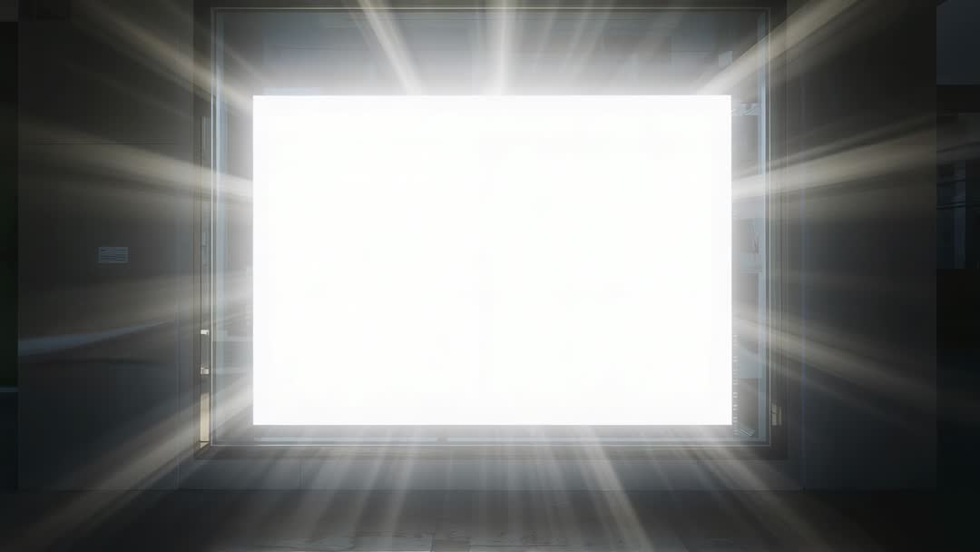 AI Generated Image. Frame from loop video showing overexposed rectangular light panel mounted on dark gallery wall, emitting intense radial beams and lens flare, casting long streaks across gallery floor and walls and creating dramatic high-contrast minimalist composition. Composition featuring strong central luminance and symmetrical rectangular aperture, suited for mood-driven visual content and contemporary art promotion. Suggested uses include background loop for exhibition promos, museum and gallery websites, event trailers, digital signage, title sequences, ambient loops for retail or hospitality, music video backgrounds, and abstract transitions in motion design. Technical tips: use 8-12 second seamless loop, reduce highlights for readable text overlays, add subtle vignette to balance extreme brightness, position typography outside bright rectangle for contrast, experiment with blend modes like screen or additive for layered visuals, and apply slow push-in or pan for gentle motion. Mood keywords for creative direction: ethereal, mysterious, futuristic, contemplative, dramatic.