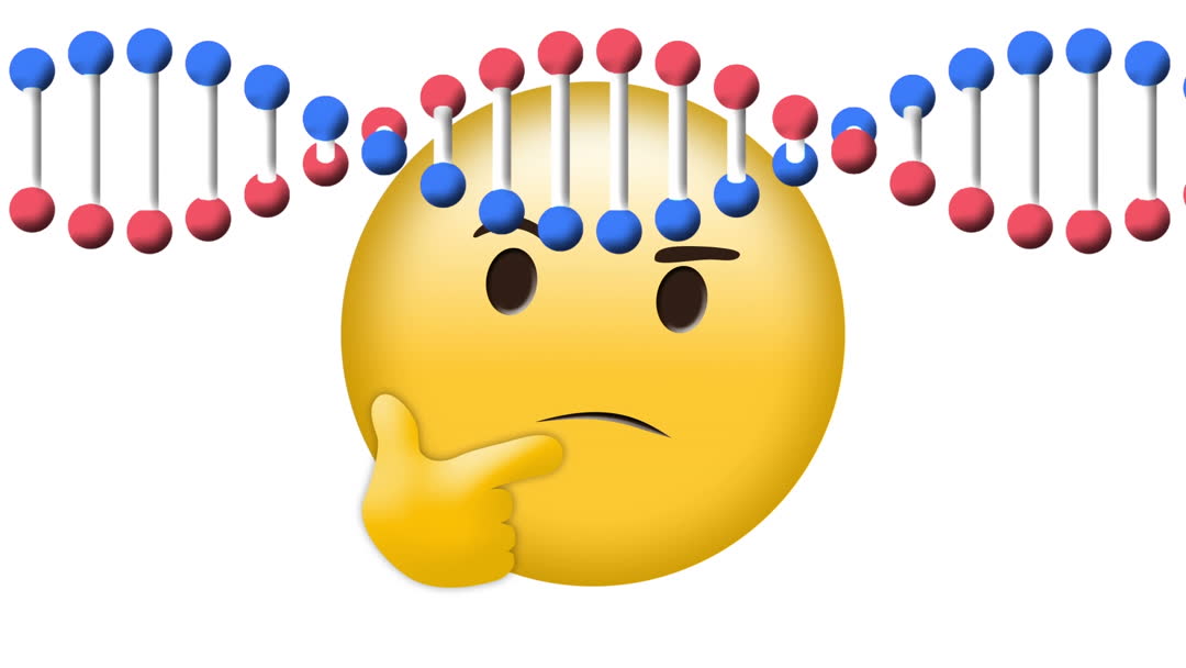 Digitally created illustration showing a thinking emoticon under DNA strand symbolizes connection between genetics and contemplation of modern technology. Suitable for science and technology websites, digital innovation events, or discussions blending emotions and modern science.