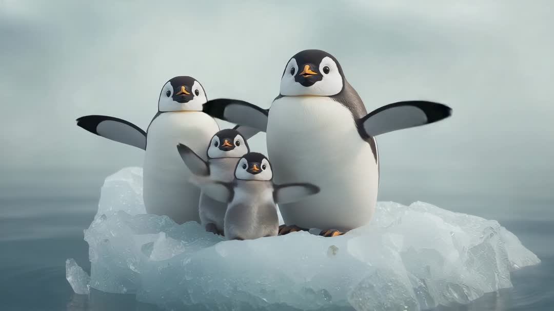 AI Generated Video. Featuring emperor penguin adults and chicks standing on drifting ice floe, waving flippers and mimicking gestures. Background presenting soft blue tones and calm open water with subtle reflections and shallow depth of field, creating gentle cinematic mood. Footage capturing family bonding and protective behavior with clear room for superimposed titles and lower third graphics. Ideal for wildlife documentary sequences, environmental and conservation campaigns, children's educational content about animal behavior, family lifestyle features, social media reels, travel and nature editorials, and seasonal greeting or fundraising materials. Composition offering loop-friendly action and negative space for text overlays, suitable for broadcast, online video, presentation backgrounds, and stock footage libraries.