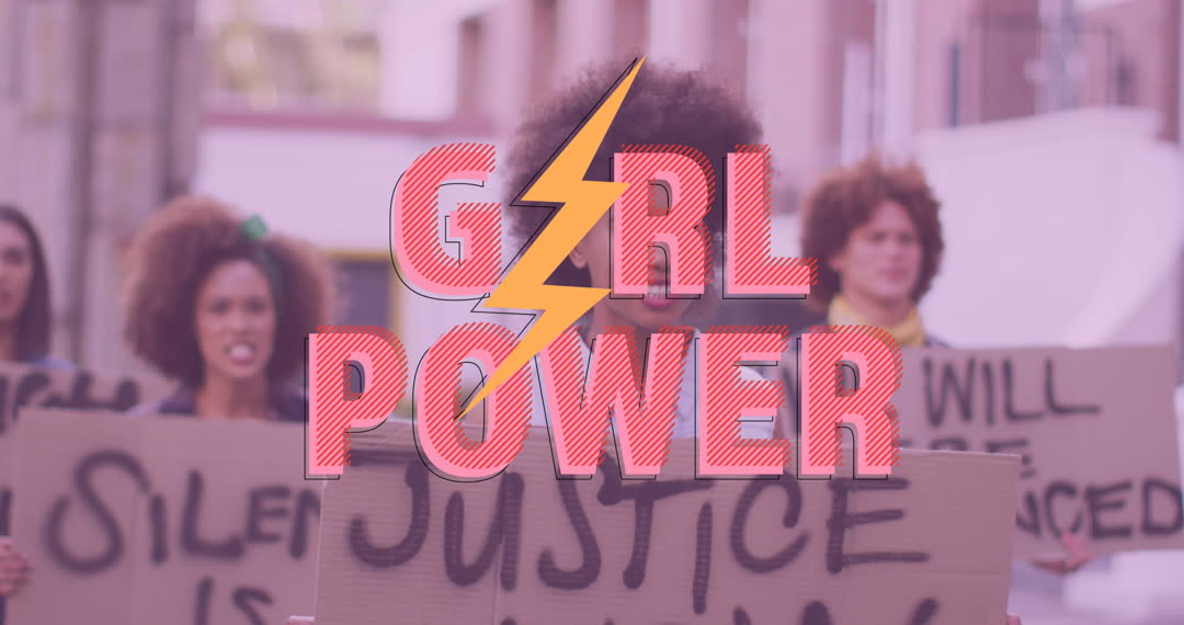 An empowering scene featuring a diverse group of women holding protest signs, overlaid with bold 'Girl Power' text in a stylized graphic. This vibrant composition captures the spirit of women's rights activism and can be used for promoting social justice events, gender equality campaigns, or inclusivity initiatives. Perfect for websites, newsletters, and social media posts focused on advocating for change and unity.