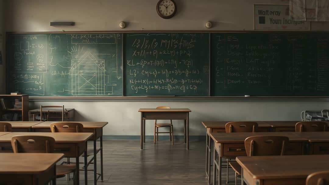 - Empty Classroom with Chalkboard Equations and Teacher's Desk