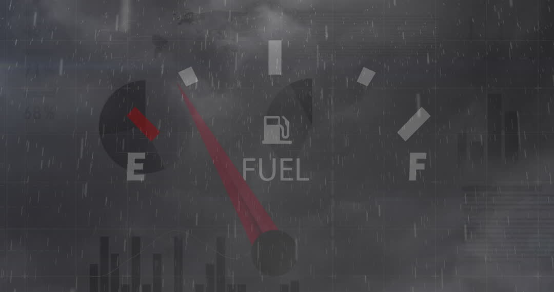 An empty fuel gauge videory combined with a dynamic stock market overlay. Highlighting themes of economic decline, fuel crisis, or broader business-related storytelling. Useful for illustrating articles or blogs on financial downturns, resource shortages, or thematic concepts on stability and consumption.