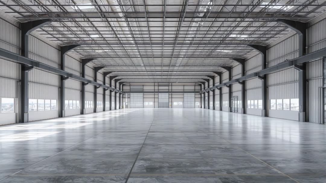 - Empty Hangar Showing Sunlight Reflecting on Concrete Floor and Exposed Steel Trusses