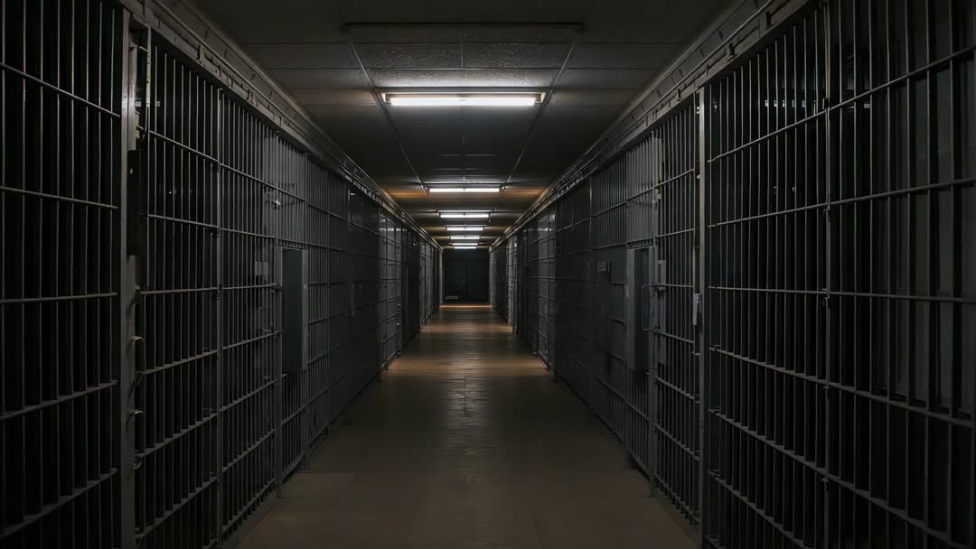 AI Generated Image. Footage showing empty cellblock corridor receding into distance under cold fluorescent lights. Metal bars lining both sides and polished floor reflecting overhead fixtures, creating rhythmic highlights and deep shadows. Composition emphasizing symmetry and vanishing point, lending cinematic tension and stark institutional mood. Usage ideas: suitable for documentary openers, true crime sequences, courtroom or legal news segments, crime drama establishing shots, title sequences, background for somber articles on incarceration or reform, podcast cover visuals, promotional trailers, museum exhibits. Working well as cutaway, slow push-in, tracking shot, or looped background plate for on-screen text or lower thirds. Post production tips: try desaturated monochrome or high-contrast cool tones to heighten atmosphere. Pair with distant footsteps, echoing ambience, or low drone underscore to increase suspense. Footage delivering versatile cinematic feel for editorial, commercial, or narrative projects.
