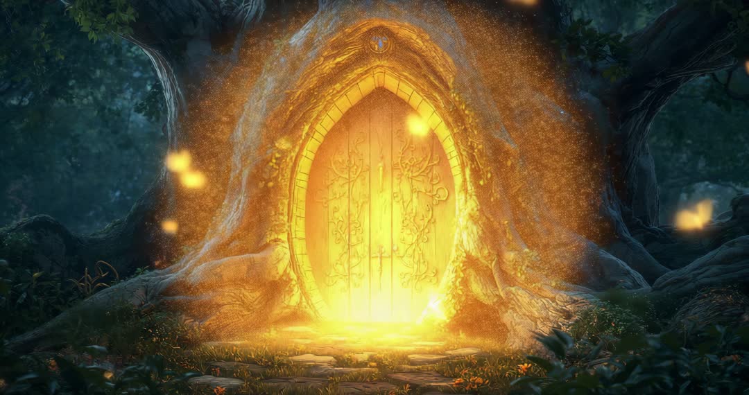- Enchanted Doorway Glowing in Mystical Forest Clearing