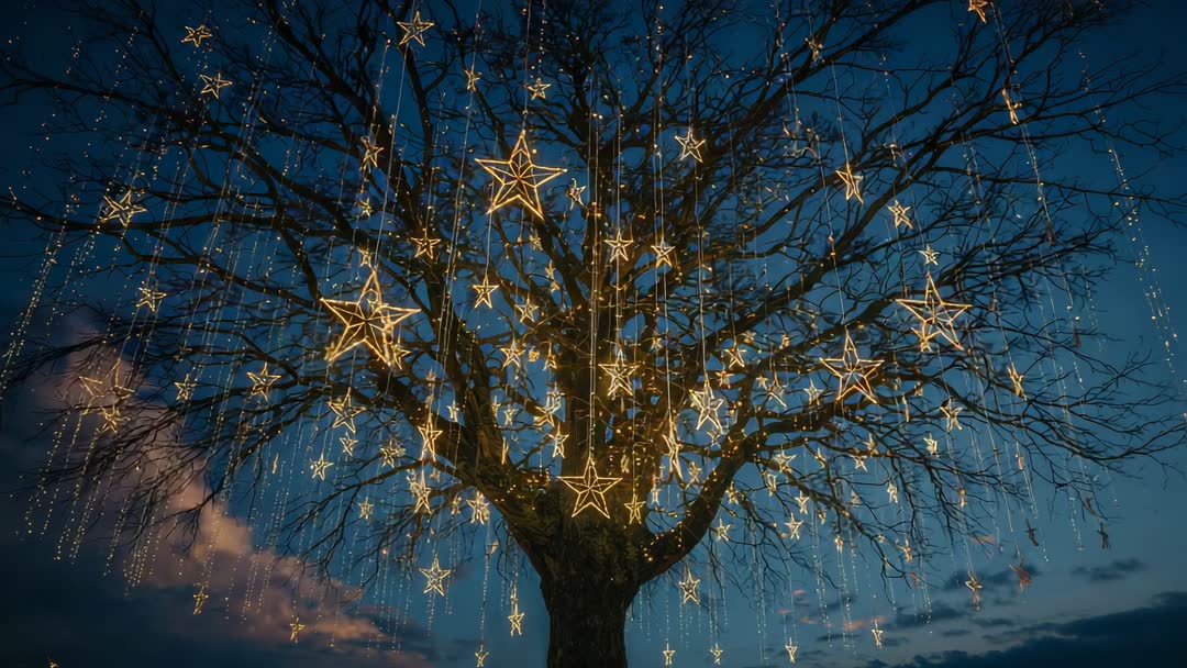 - Enchanted Tree Illuminated by Hanging Star Pendants at Nightfall