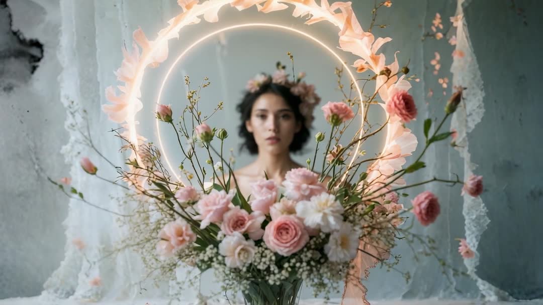 AI Generated Image. A model is creatively presented with a glowing circular light framing their head, enhancing the ethereal and elegant atmosphere. Positioned centrally, she wears a crown made of flowers, beautifully complemented by a floral arrangement in a glass vase underneath. This delicate setup, with soft lighting and pastel colors, advances a dreamy style, suitable for backgrounds, fashion blogs, and artistic publications focused on sophisticated beauty and modern aesthetics.