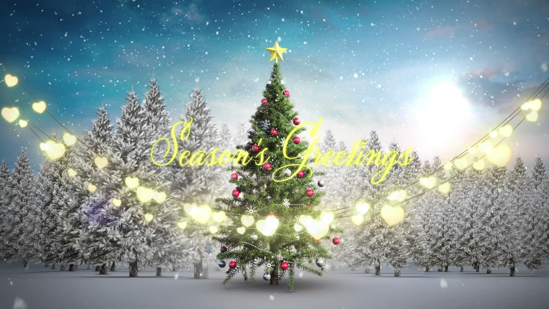 Beautiful winter scene featuring a decorated Christmas tree with playful snowfall and glowing holiday lights in a snowy forest backdrop. This animated season's greetings concept is ideal for creating festive holiday cards, promotional materials for Christmas celebrations, or winter-themed event banners.