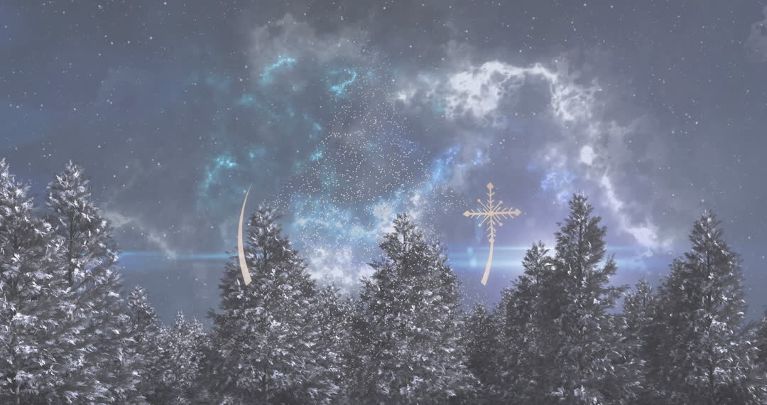 Stunning depiction of a snowy woodland under twinkling stars and a mystical aurora, perfect for Christmas and holiday-themed projects. Ideal for seasonal greetings, wallpapers, holiday invitations, or backgrounds in promotional materials celebrating winter's magical atmosphere.