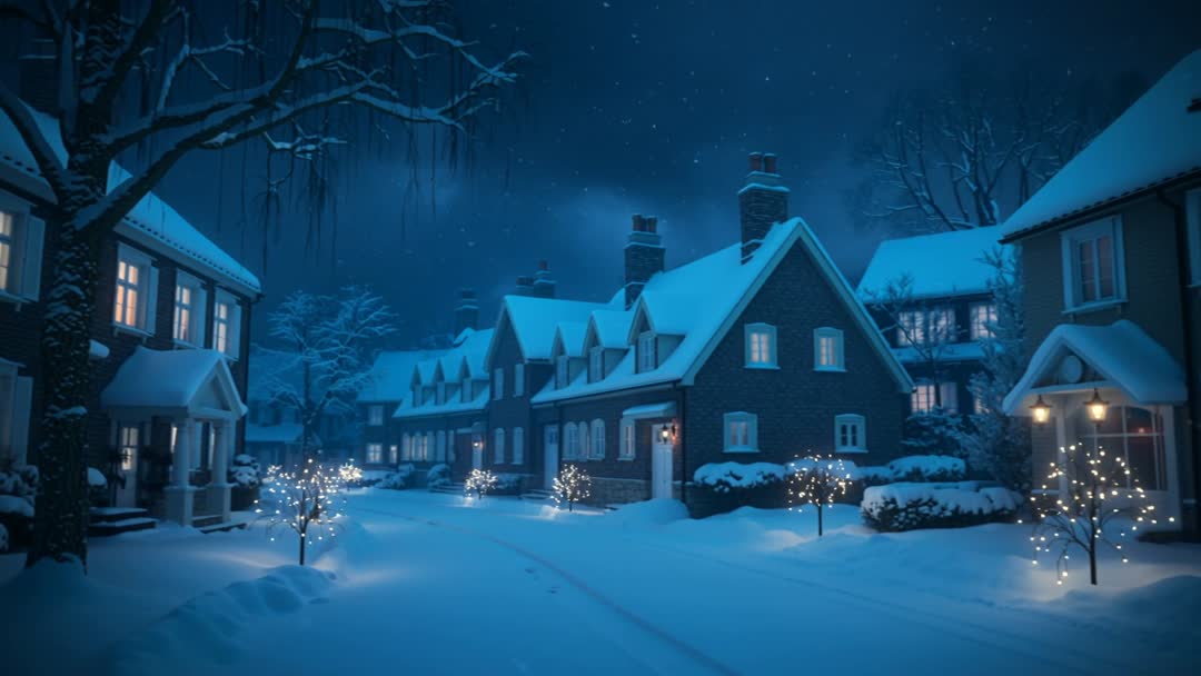 AI Generated Video. The video pans across a serene, snowy residential street, highlighting brick homes enveloped in a winter wonderland. Lit trees and twinkling icicles enhance the festive atmosphere under a starry night sky. Use this depiction of quiet beauty for holiday-themed content, winter wonderland promotions, or serene, rural seasonal advertising. Ideal for highlighting the calming aspects of winter evenings.