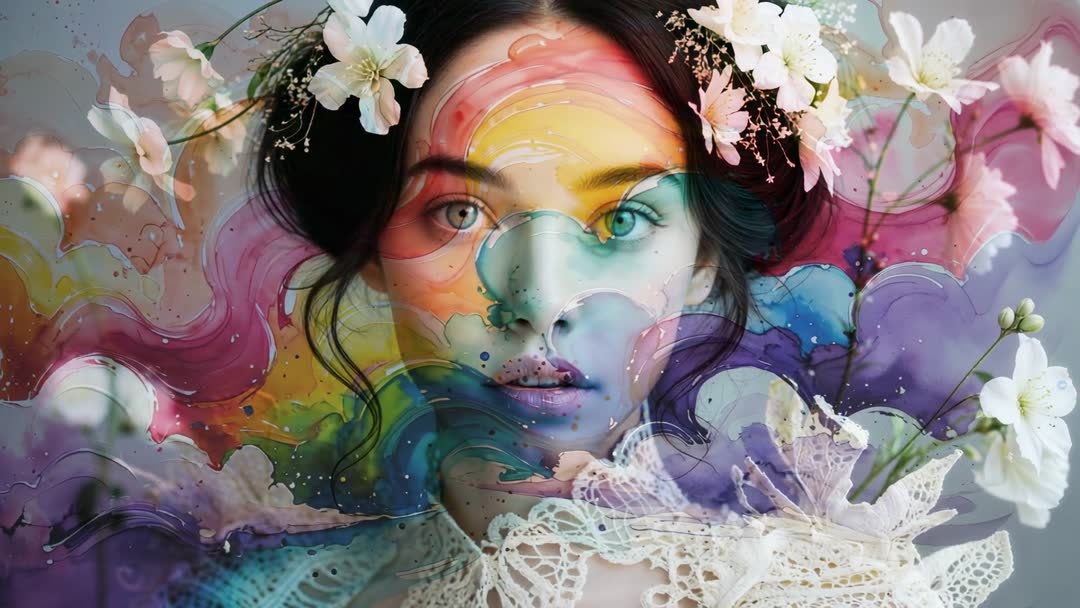 AI Generated Video. Artistic portrait depicting a woman's face intersected by vibrant rainbow paint waves and accented with white blossoms. The serpentine colors contrast elegantly, portraying an avant-garde and dreamlike beauty ideal for creative projects or print media focused on art, beauty, and fashion dynamism.
