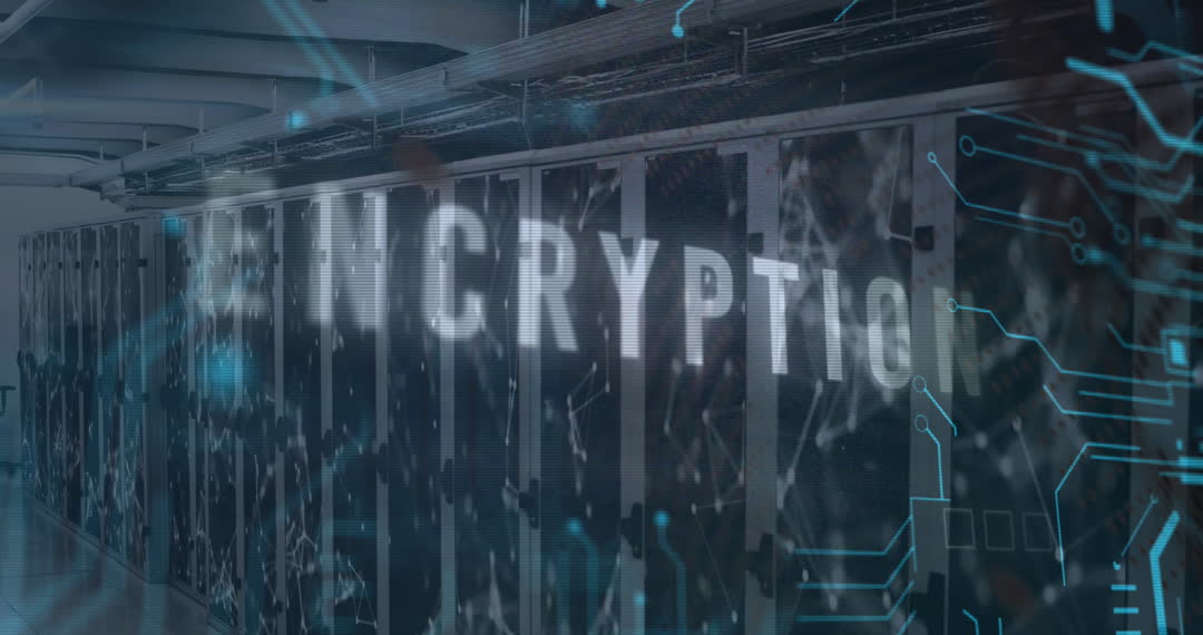 Depicts digital encryption technology with virtual text overlaid on industrial servers, suggesting data security. Suitable for use in articles or content focused on cybersecurity, data protection, or advancements in digital encryption technology.