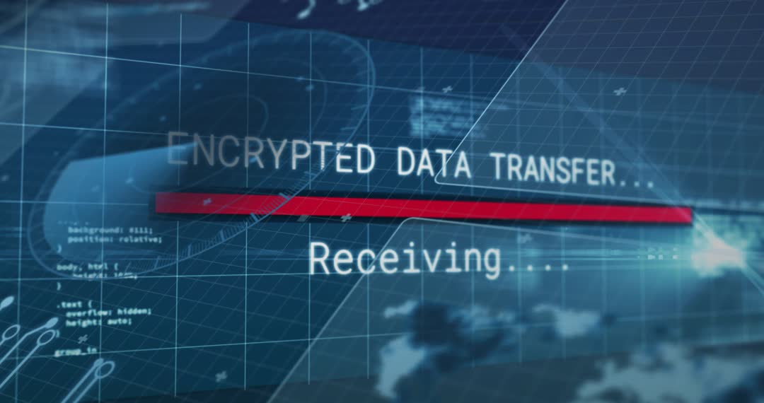 Loopable video clip showing encrypted data transfer interface with red progress bar sliding right and "Receiving..." label appearing over blue HUD grid. Visual elements including translucent grid overlays, radar-style circular graphics, circuit traces, code snippets, and subtle light flares creating high-tech atmosphere. Motion showing smooth camera parallax and glowing HUD accents for dynamic energy. Ideal for cybersecurity and IT security presentations, network operations center backgrounds, corporate tech videos, app demos, news segments on data breaches or encryption, online courses on network security, and conference visuals. Works well as website hero animation, lower-third background, title sequence, or full-screen opener. Color grading and overlay text ready for brand customization and captioning.