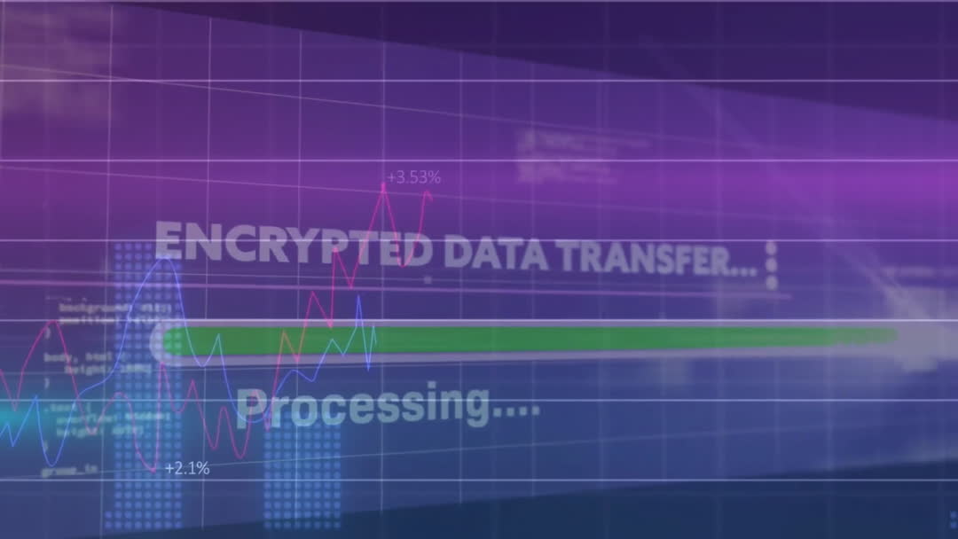 Dynamic visual showcasing encrypted data transfer concepts. Ideal for use in presentations on cybersecurity, IT infrastructural development, or explaining data flow in technology sectors. The presence of graphs and digital animations emphasizes modern data processing techniques, suitable for lecture slides, tech websites, and educational materials.