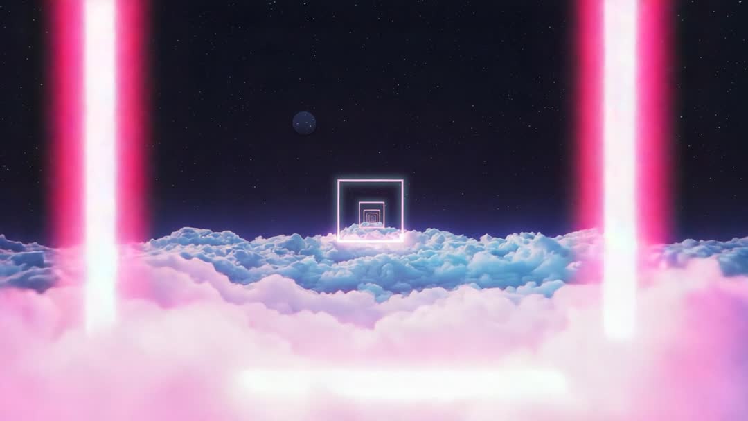 AI Generated Image. Featuring nested neon square frames receding into distance above soft pastel cloud layer, casting warm pink and cool blue illumination across misty surface. Vertical neon beams flank composition, creating symmetrical frame and high-contrast focal corridor against starry night sky. Camera slowly dollying forward through tunnel, creating hypnotic, loopable motion ideal for seamless video loops. Color palette blending cotton-candy pinks and icy blues offering retrofuturistic, vaporwave mood. Motion pacing working well with slow synth or ambient soundtrack. Use for music visualizers, VJ loops, sci-fi title sequences, website hero backgrounds, social media stories, album covers, event projections, and tech advertising. Suggest editing tips: render as seamless loop, adjust color grade to match brand, add subtle grain or lens glow for cinematic feel, and place minimal text or logo inside central frame for strong title card. Provide versions with and without vertical beams for flexible composition.