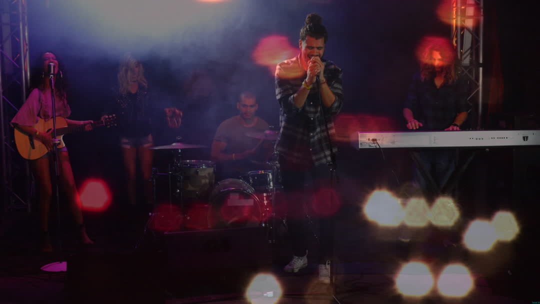 A vibrant depiction of a band performance on stage, featuring a lead singer passionately engaging the audience, accompanied by musicians playing guitar, drums, and keyboard. The video captures dynamic light effects blending into the background, adding a lively and urban aesthetic. Perfect choice for delivering powerful music experience in promotional content, event posters, music industry articles, and lifestyle blogs handling nightlife themes.