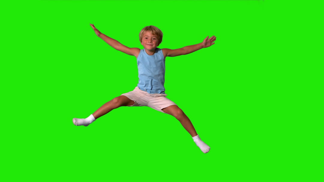 Boy joyfully extends arms and legs, creating video full of energy against vibrant green backdrop. Ideal for educational content, advertisements related to children's products, or promotional material emphasizing energy, playfulness. Allows for creative editing due to green screen background.