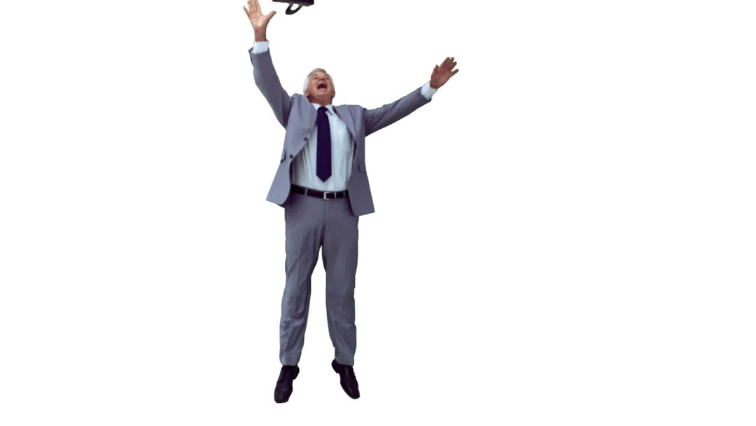 Image shows a businessman in a suit celebrating a victory by enthusiastically throwing his briefcase. The white background highlights the businessman's joyful expression and movement, conveying success and achievement in the corporate world. Suitable for conveying themes of business success, motivation, enthusiasm, and professional achievement in marketing materials, corporate presentations, and business websites.