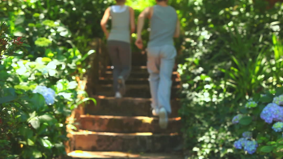 - Energetic Couple Running up Garden Steps Surrounded by Lush Greenery