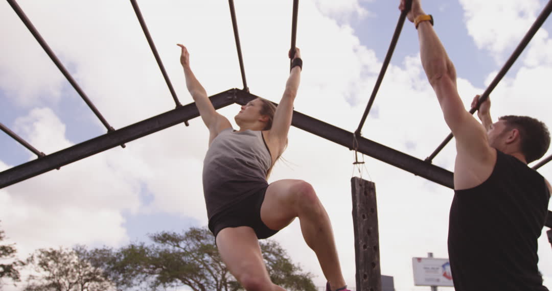 - Energetic Couple Training on Outdoor Fitness Monkey Bars