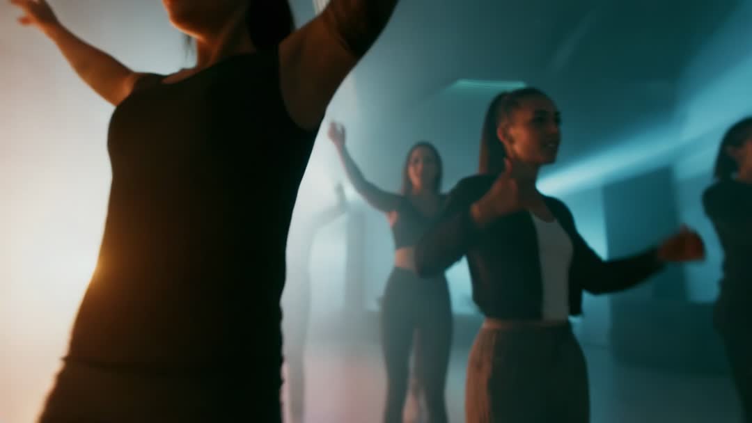 AI Generated Video. This scene captures a group of dancers engaging in dynamic and expressive movements, surrounded by atmospheric fog and vibrant lighting. The energy of the performance is depicted through their flowing motions and athletic attire. Suitable for highlighting contemporary dance styles, fitness inspiration, or choreography sequences, this can illustrate concepts of energy, movement, and creative expression.