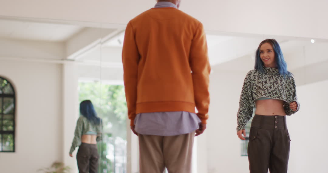 Dancers energetically practicing in a sunny studio reflect in the large mirrors, showcasing commitment and expression. Ideal for projects related to dance education, arts promotion, creativity in motion, and multicultural teamwork.