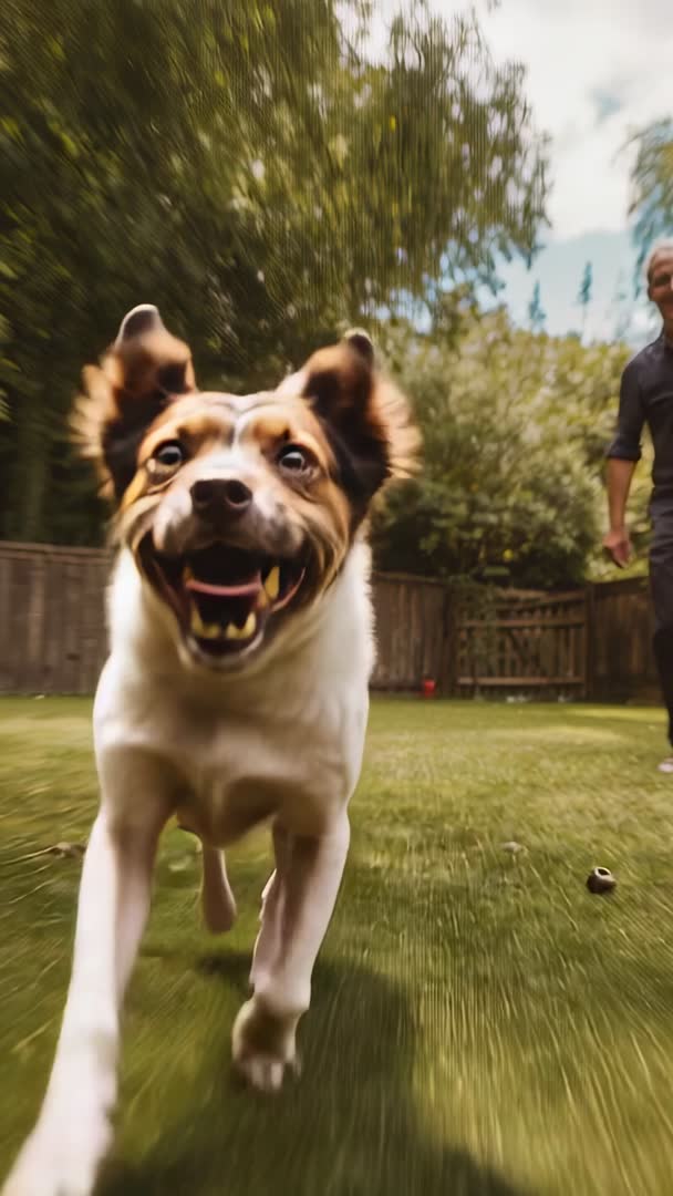 AI Generated Image. Showing medium-sized dog running directly toward low camera across green lawn in fenced backyard. Closeup low-angle framing capturing excited facial expression, open mouth, and forward motion. Motion blur background conveying speed and playful energy. Owner appearing in background calling dog while toy lying on grass. Vertical video format working well for mobile portrait content and short-form social clips. Suggested uses include social media reels and stories, pet brand advertising, dog training tutorial clips, adoption and rescue promotion, veterinary clinic or groomer websites, family lifestyle videos, mobile wallpaper and looped backgrounds. Suitable for thumbnails and article headers about canine behavior, exercise, backyard play, and pet care.