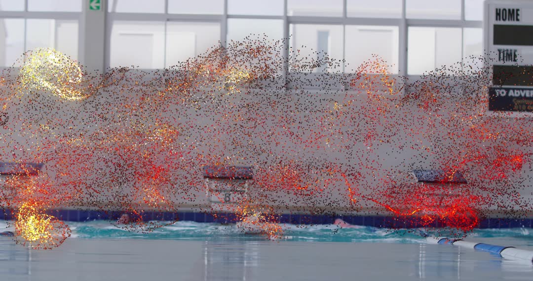 Energetic Motion of Competitive Swim Meet with Dynamic Particle Waves Video
