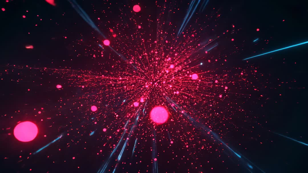 AI Generated Image. A striking cosmic explosion depicted in this digital animation with red orbs and cyan streaks bursting outward from a central cluster, forming a mesmerizing starburst effect. Perfect for projects involving cosmology, futuristic themes, science fiction productions, or as a vibrant background for technology and digital applications. The dynamic nature of the particles conveys a sense of vigor and power that can enrich any visual presentation or multimedia project.
