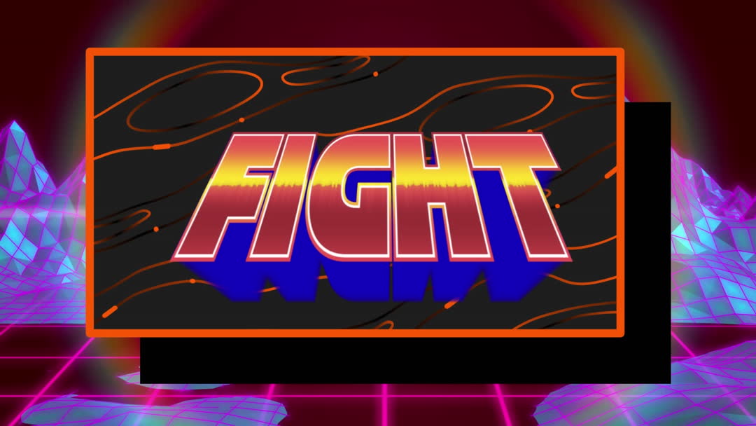 Dynamic text animation featuring the word 'FIGHT' in vibrant retro style with bold colors. The neon geometric shapes in the background evoke a vintage aesthetic, reminiscent of classic arcade games. Ideal for use in social media graphics, video introductions for gaming channels, retro game promotions, and digital interface design projects.