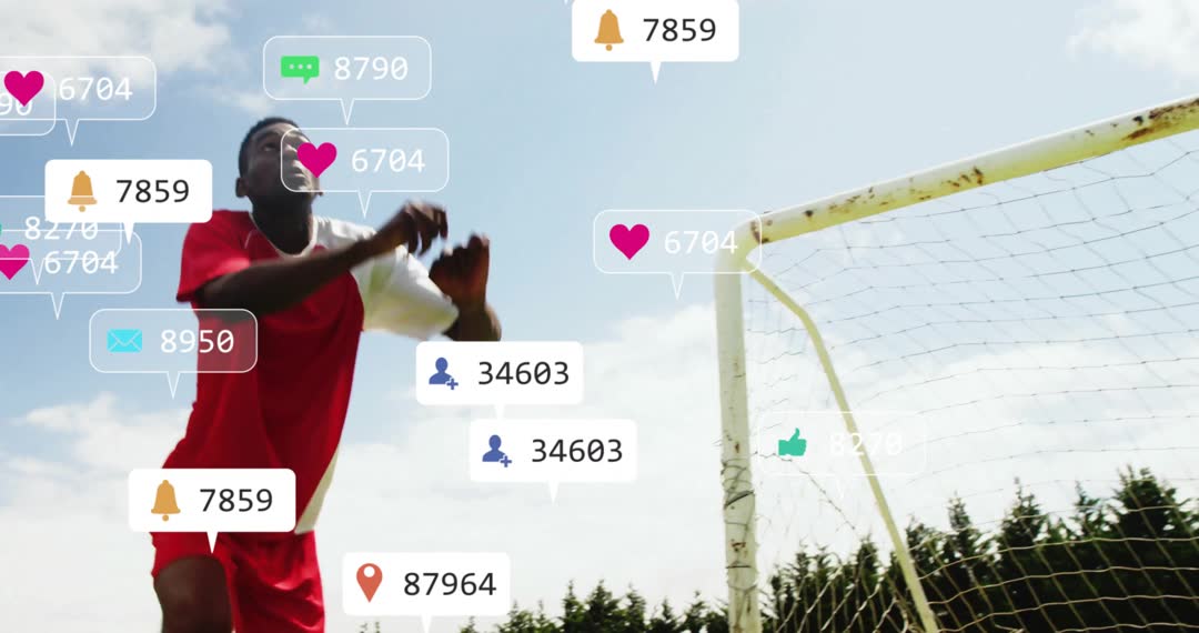 A dynamic depiction of a soccer player in mid-air showing excitement and energy on the field while surrounded by various social media interaction icons. This video represents the intersection of sports and social media engagement, making it perfect for advertising campaigns, online sports content, and articles on sports influence on social media.