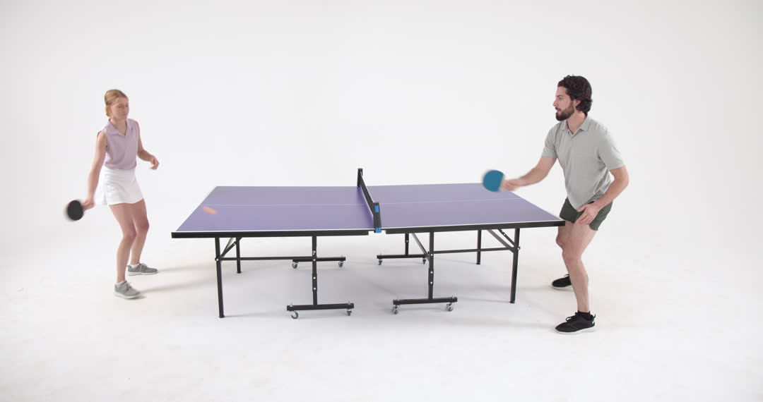 Two people are playing table tennis in an indoor studio. Both appear focused and competitive, emphasizing sportsmanship and practice. It is an energetic scene ideal for promoting fitness activities, emphasizing the intensity and agility of indoor sports. Useful for websites related to exercise programs, sports gear sales, or competitive sports training.