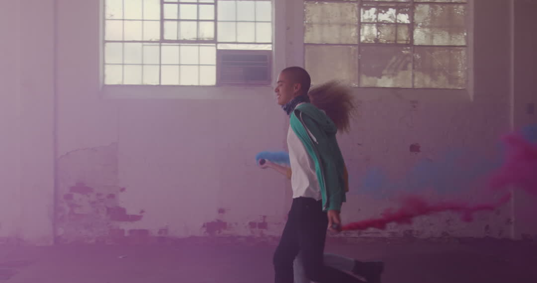 This scene captures a dynamic moment where a young man and woman run energetically through an empty warehouse with colored smoke bombs. The vibrant atmosphere embodies creativity, freedom, and youthful spirit. Ideal for use in campaigns or advertisements highlighting bold expression, multiculturalism, or urban settings.