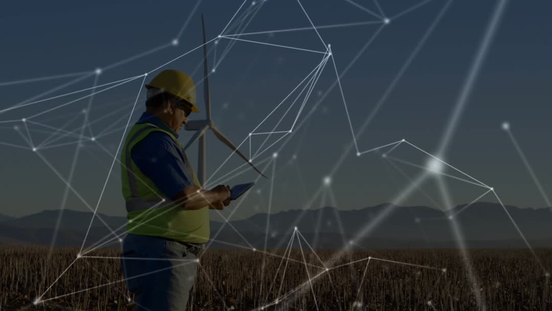Video shows an energy engineer standing in an open field with wind turbines, tapping on a tablet while a digital network overlay connects the surrounding elements, suggesting connectivity and innovation in renewable energy. Useful for illustrating technological advancements in sustainable energy sectors and for promotional content on green technology integration.